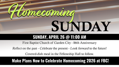 Join us on Sunday, April 26, for our Annual Homecoming Sunday. Together we'll reflect on the past, celebrate the present, and look forward to the future of FBC Garden City. Make plans to stay after for Homecoming Sunday Meal - we'll provide the meat and beverages and if you're able, you can bring a side or dessert to share!
