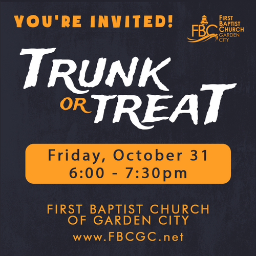You're invited to join us for Trunk or Treat 2025 at First Baptist Church of Garden City. It's a safe, fun event designed with you and your family in mind!
