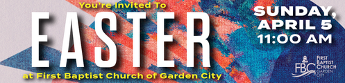 You’re invited to First Baptist Church of Garden City on Easter Sunday at 11:00am to celebrate the turning point of human history - Jesus' empty tomb - and how the same power that raised Him from the grave is available to you today!